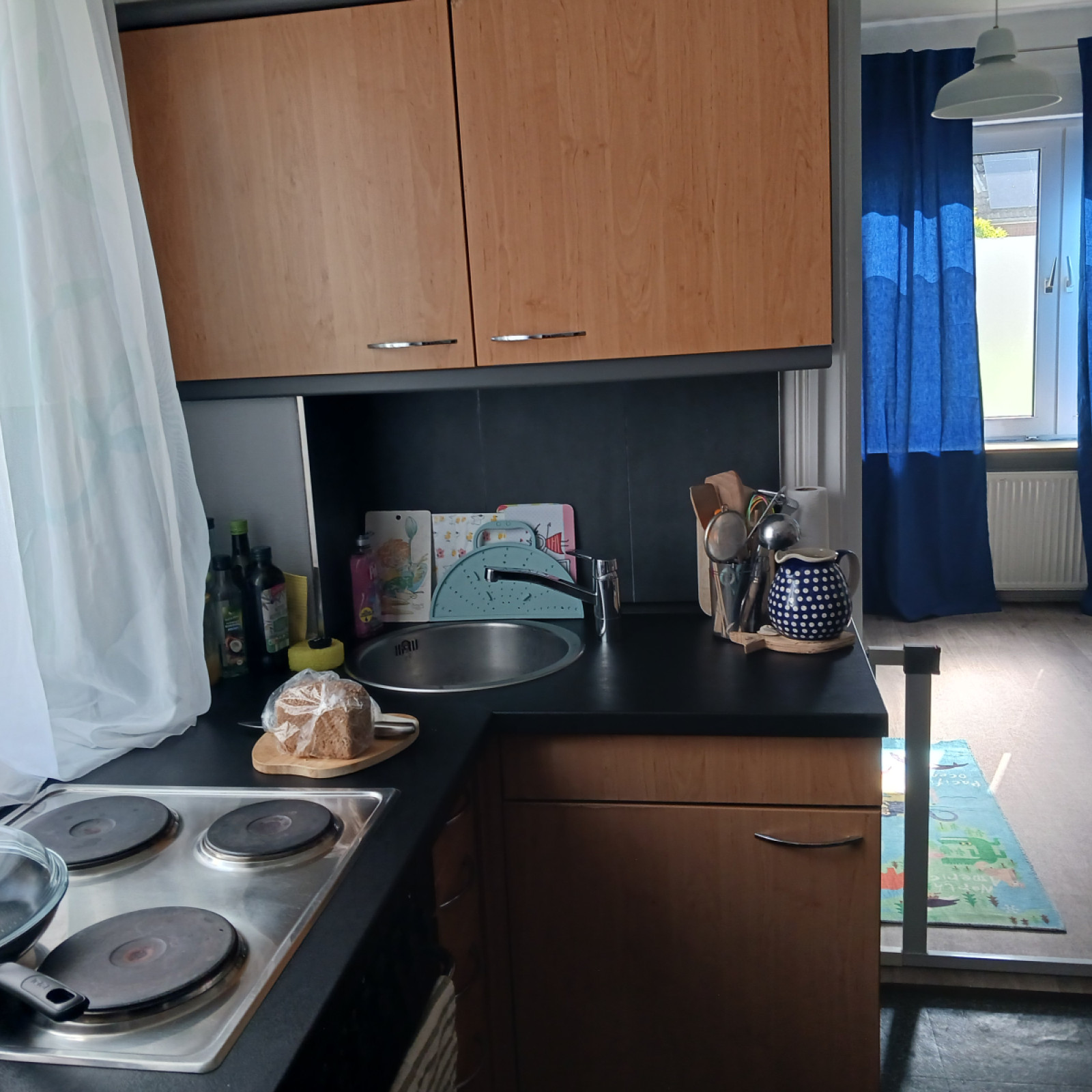 Für den Mittagsschlaf oder um sich auszuruhen gibt es den Schlafbereich mit einer eigenen Matratze für jedes Kind. Die Küche ist besonders wichtig: hier bereiten wir – auch oft gemeinsam mit den Kindern – die Mahlzeiten zu und lassen es uns zusammen am großen Tisch schmecken. In den Räumen gibt es verschiedene Bereiche zum Basteln oder Spielen – manche Bereiche werden auch für verschiedene Anlässe umgeräumt. In den Räumen wird natürlich nicht geraucht.